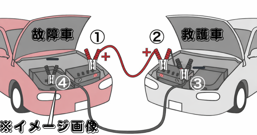 ※もし金属部分が見つからない場合、故障車のマイナス端子に直接繋ぐことも可能ですが、必ず最後に接続し、火花が出ないよう十分に注意してください💡