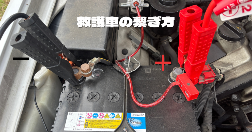 赤ケーブルの片方を救護車(助けてくれる車)にセット